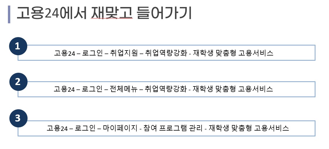 * 첨부파일이 없습니다.5월에 재학생 맞춤형 고용서비스 사이트가 폐지되고 고용24로 통합하였습니다.